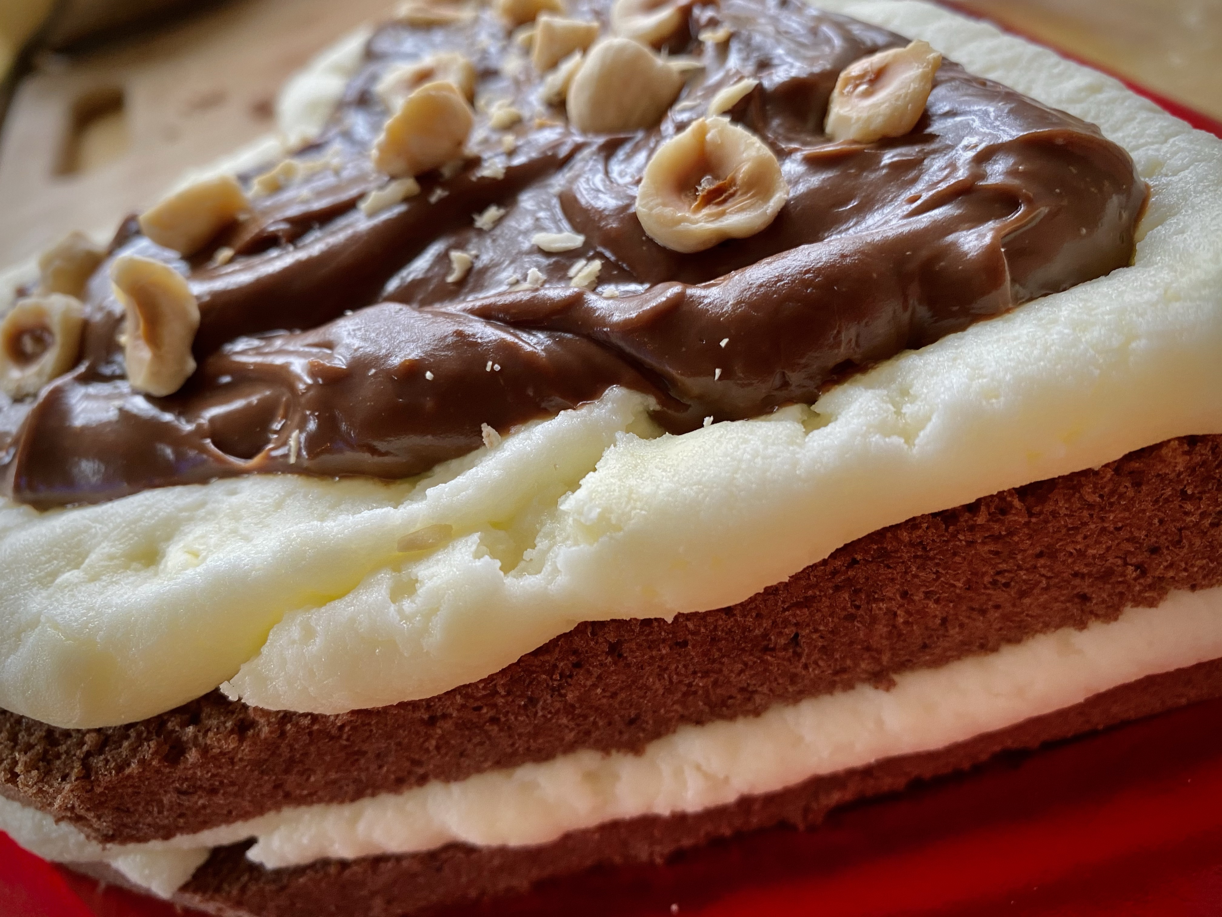 Una volta delineato il perimetro del disco di pan di spagna, irroriamolo senza esagerare con la bagna al caffè ed infine, farciamo con la crema pasticciera al cioccolato e qualche nocciola tritata grossolanamente. Ripetiamo con entrambi gli strati di farcitura e stratifichiamo il tutto.