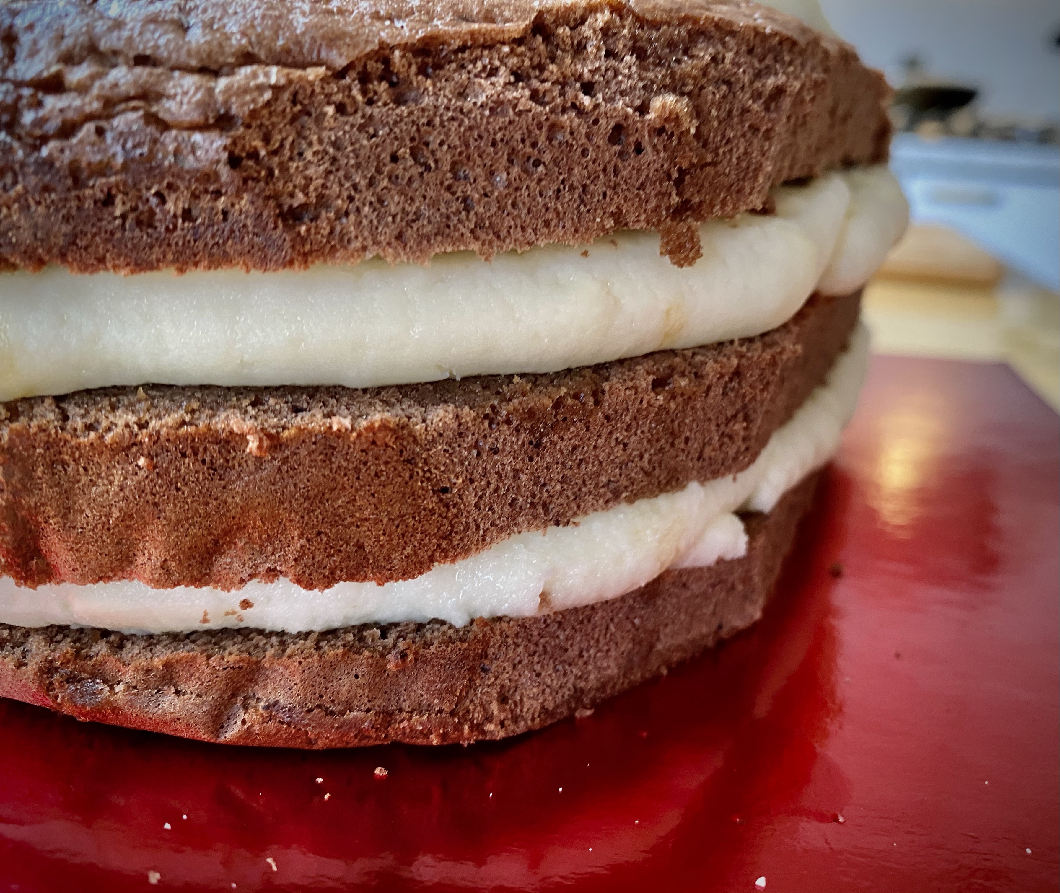 Una volta pronta, versiamo la crema in una sac à poche e lasciamo che si rapprenda un minimo in frigo; data infatti l’alta percentuale di burro al suo interno, potrebbe ammorbidirsi troppo mentre la lavoriamo, rendendo così impossibile assemblare la torta.